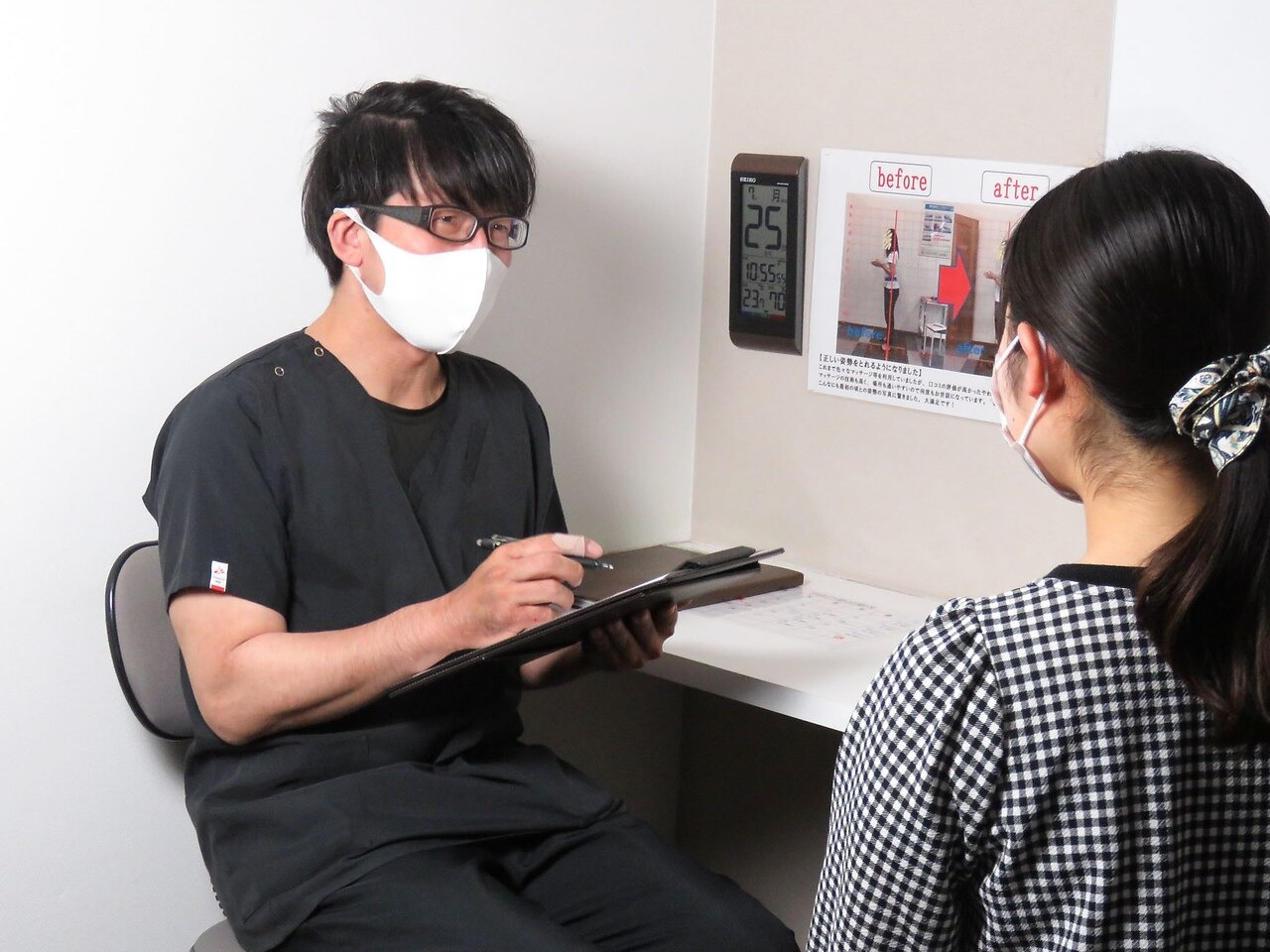 予約の受付をしている整骨院です。毎週決まった時間に通院できて、待ち時間の心配もありません。